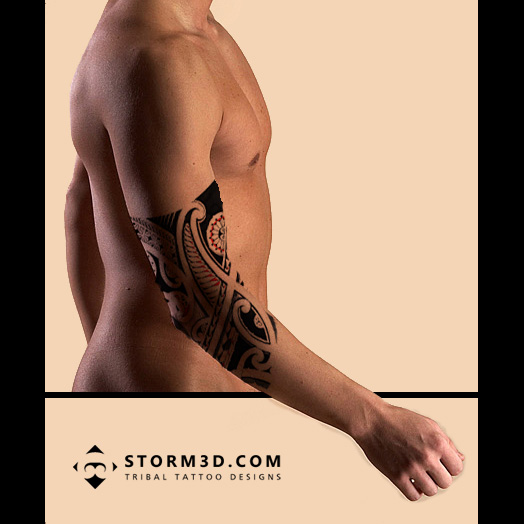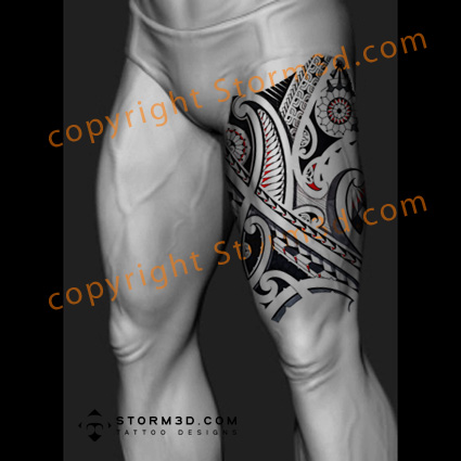 This is quite a large tattoodesign, which fit’s your upperback and stomach (see digital mockups below). It has a nice Maori koru or fern leaf in one of the white curves, and you can see a compass in the upper left corner, with a row of turtleshell patterns above it. If you wish to order the full mirrored version, just let me know at info@storm3d.com